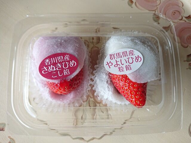 いちご大福は、香川県産さぬきひめを使ったこしあんと、群馬県産やよいひめを使ったつぶあんの2種類があります。