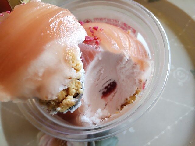 一番下には、歯ごたえがいいクッキークランチが敷き詰められて、真ん中にはいちごソースも入っています。