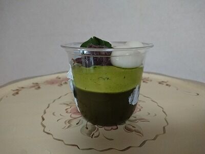 横から見ると、グリーンティー風ゼリーと抹茶のムースが2層になってるように見えますが、このゼリーの中には、角切りの抹茶寒天が入っていました。