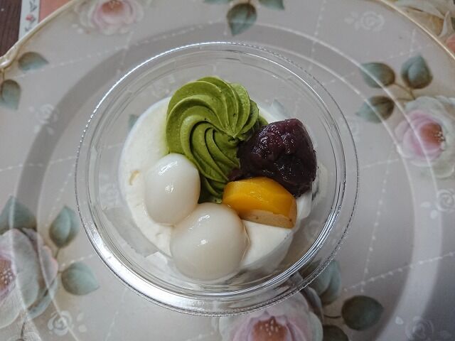白玉と抹茶ホイップ、つぶあんがのっています。
