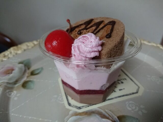 チョコプリン、苺ソース、苺のババロア、ホイップクリームの4層のど真ん中に、スポンジが忍ばせてあって、食べてて楽しい組み合わせになっています。