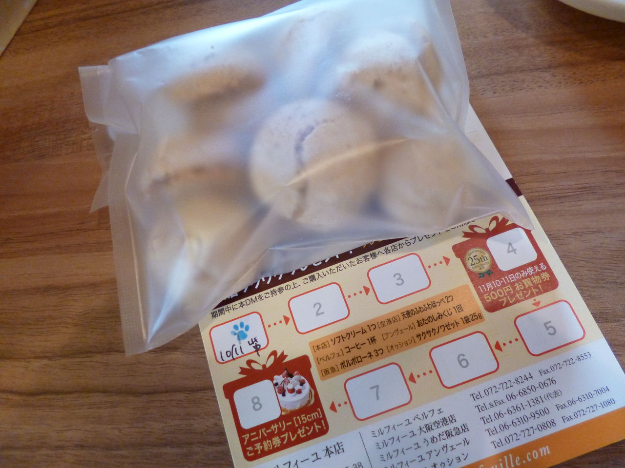 この2ヶ月間有効のハガキを持っていって買い物すると、ちょこっとお菓子がいただけます。1回目はザクザクしたかわいいクッキーのポルポローネ2コでした。