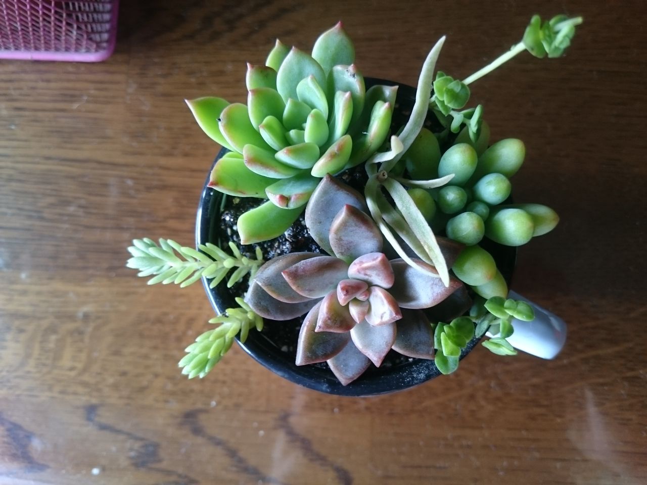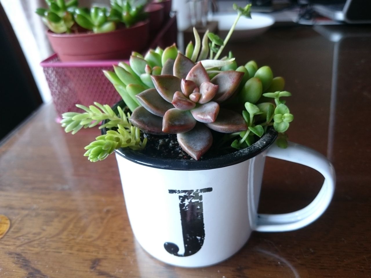 今回の子たちは、外で育てていたので、この寄せ植えも外でOKだそうです。そして、水は2週間に1回で、たっぷりあげること。私は1週間に1回くらいのペースだったので、ちょっとあげすぎでした。