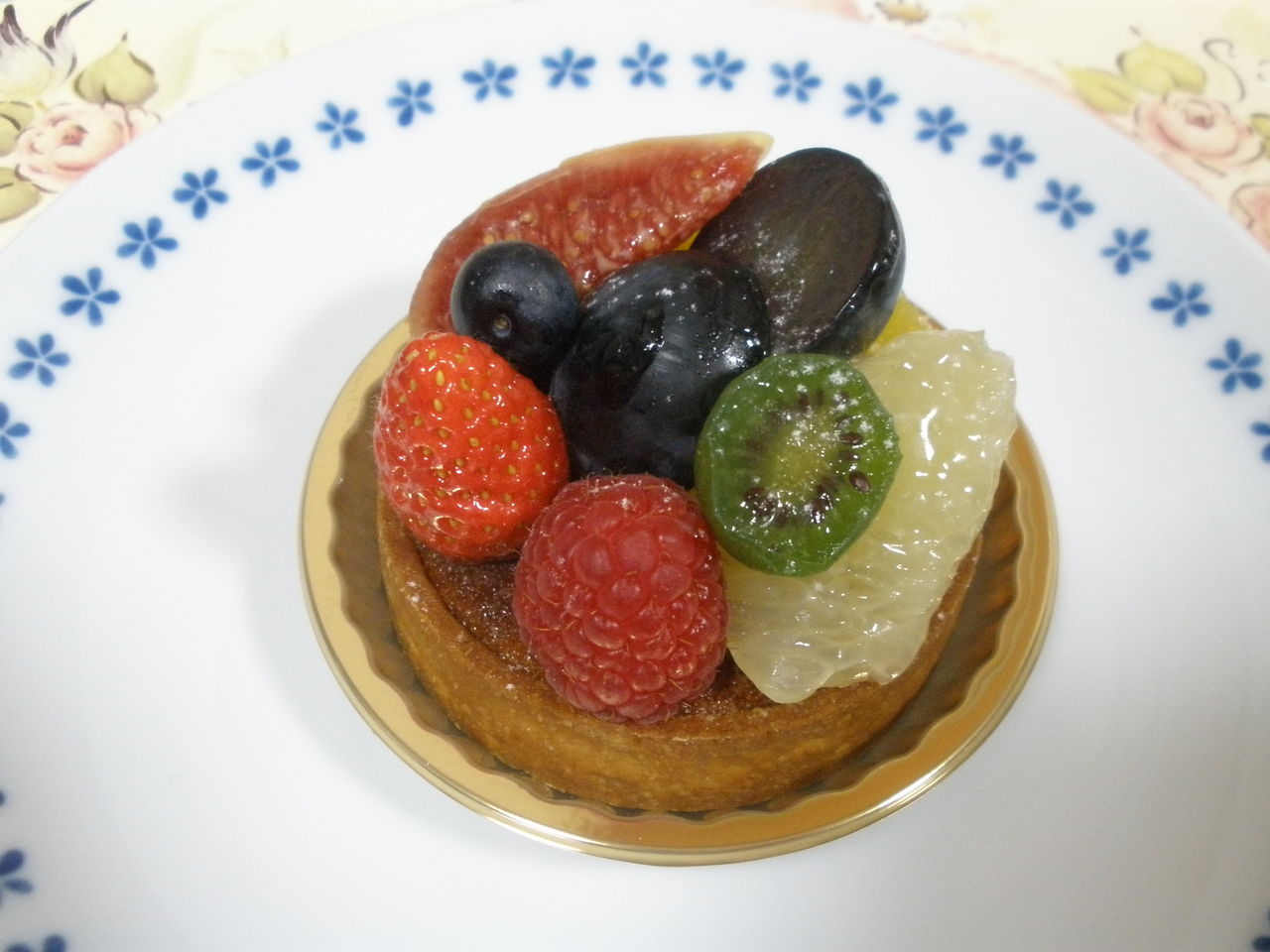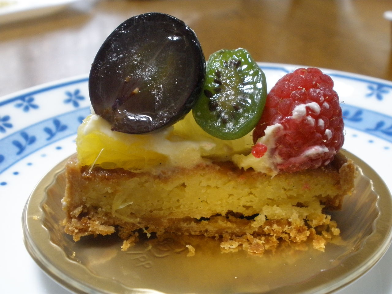 サクサクのタルト上にほんの少しカスタードがあって、その上にオレンジ、グレープフルーツ、ラズベリー、ブルーベリー、いちご、巨峰、キーウィ(見たこともないほどちっちゃいキーウィです)がちょこんと乗ってます。生クリームとかが苦手な人にはぴったりです。