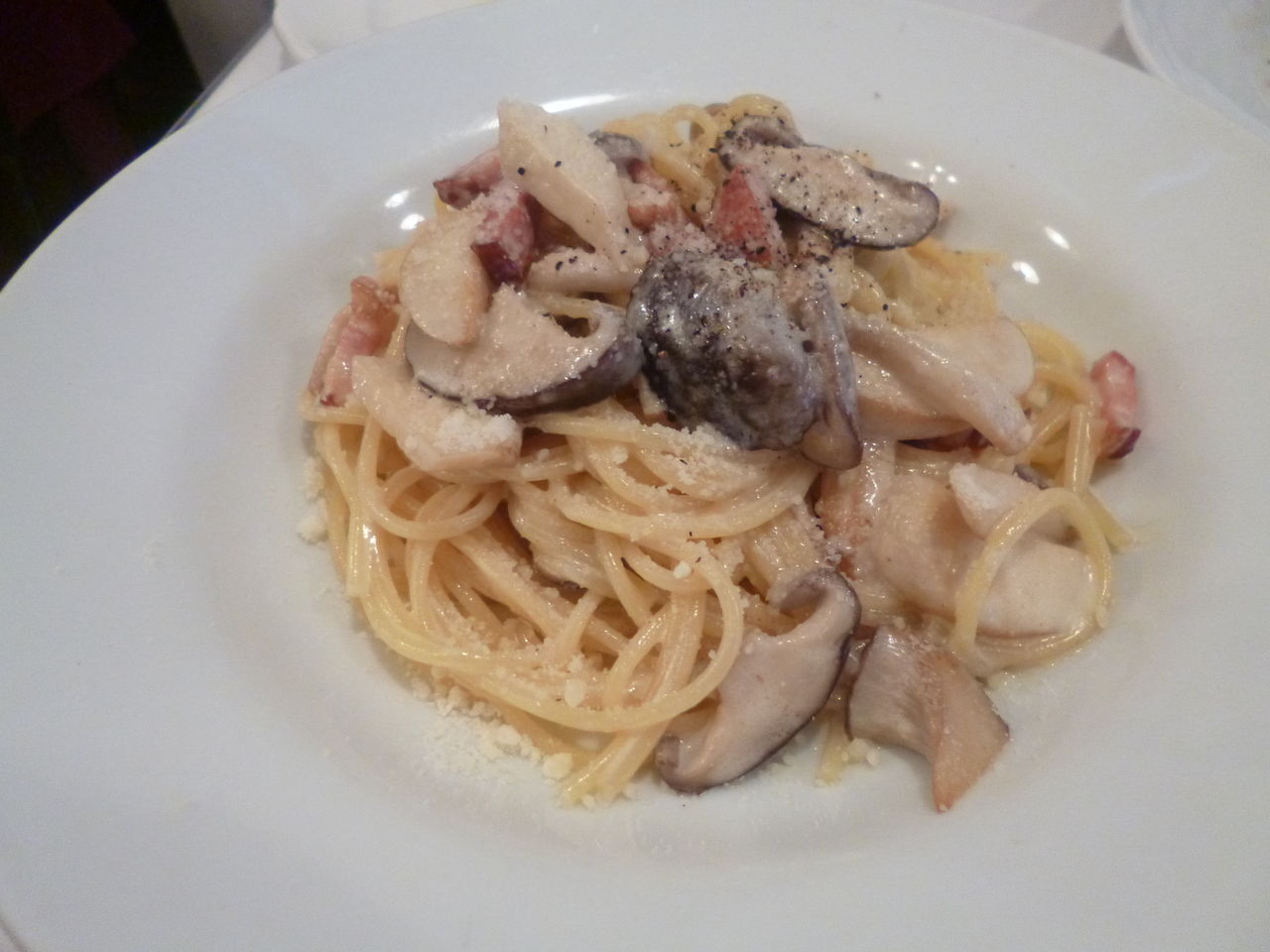 エリンギとしいたけが大きく切られて食べごたえあり。クリームソース仕立てだけどしつこくなくて、粉チーズも最初からふられてたけどにおいが気にならないおいしいパスタでした