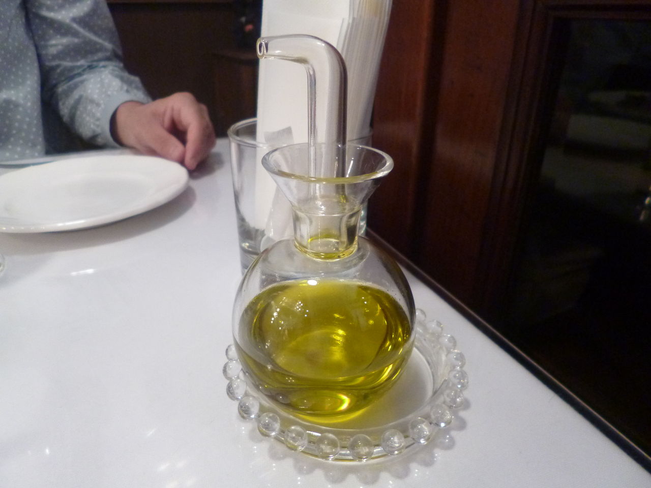 オリーブオイルがテーブルに用意されてます。このかわいいフォルムの入れ物がまったく液だれしないすぐれものでした。