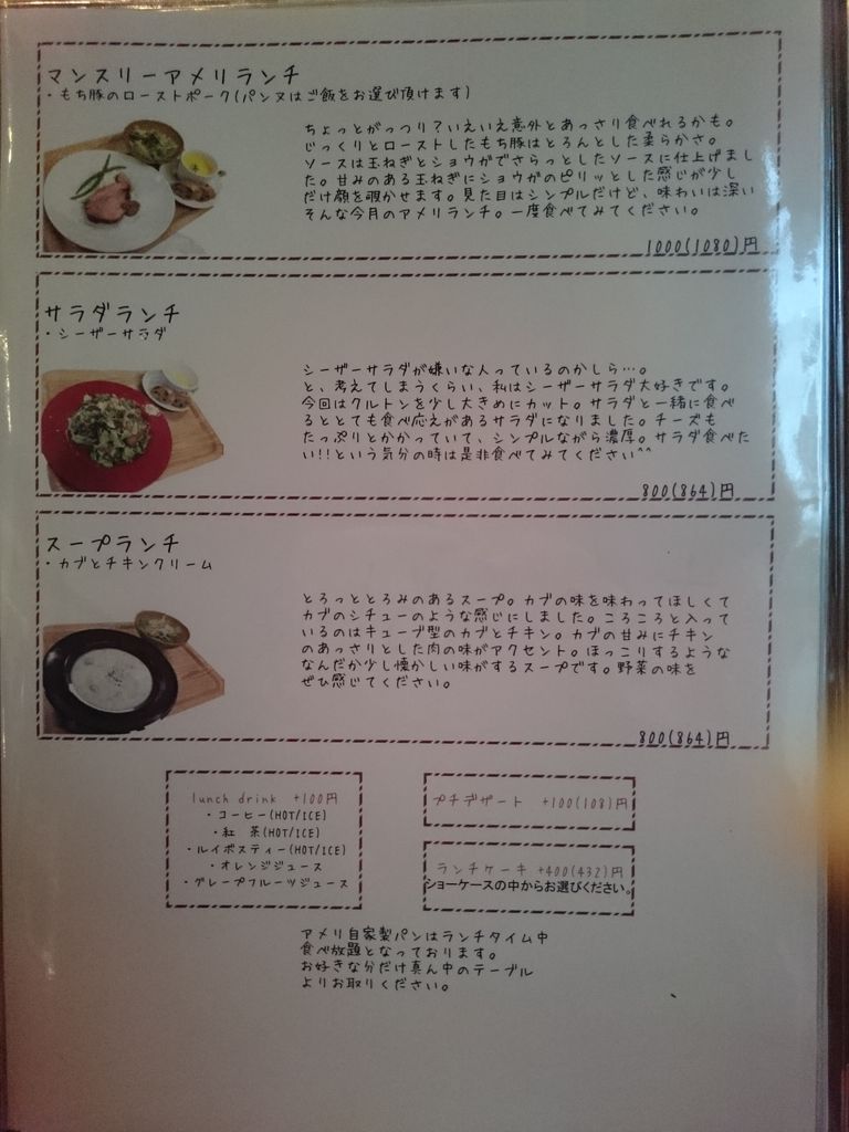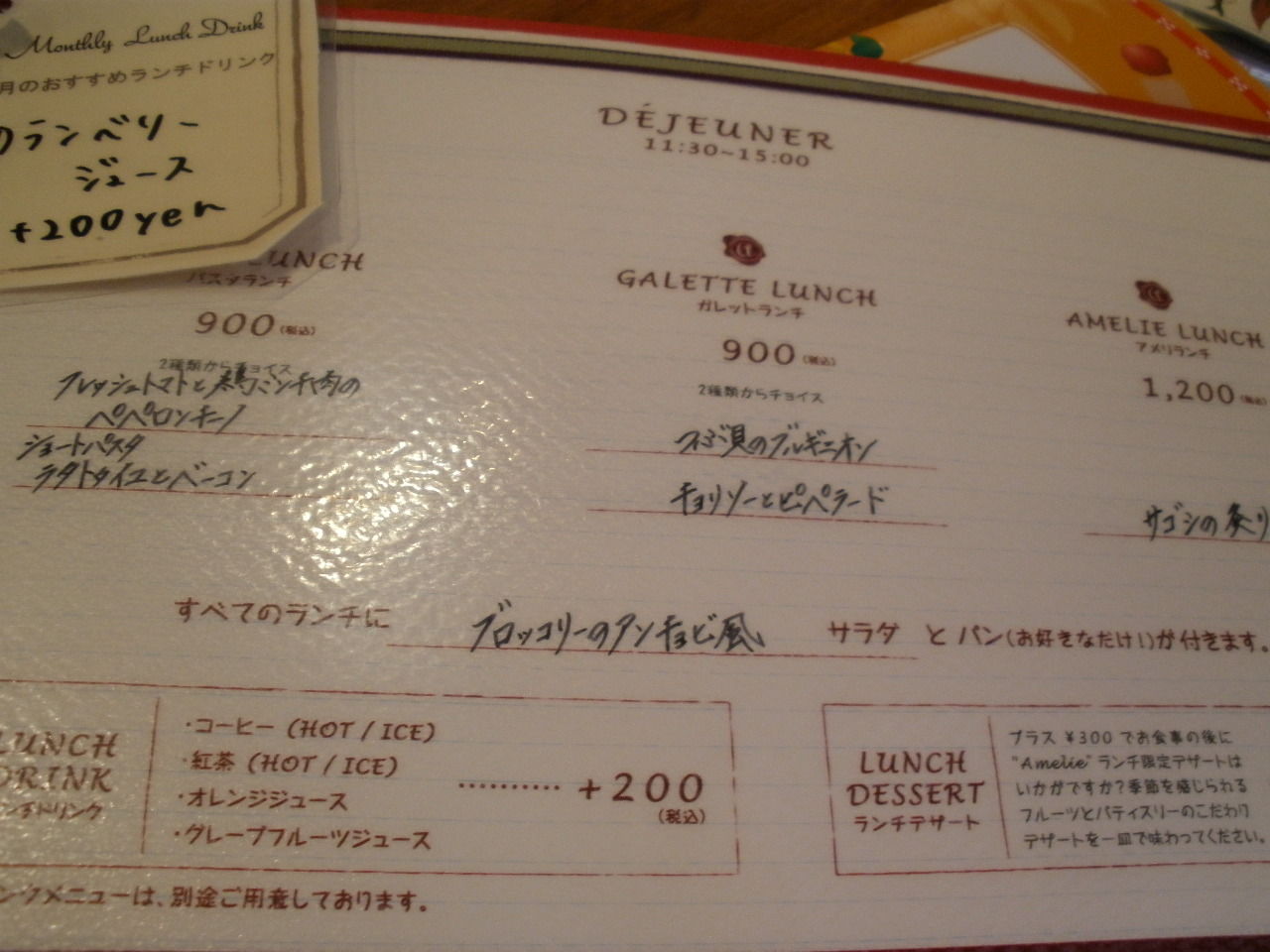 アメリランチはパスタやガレットのかわりにメイン料理があって¥1200。