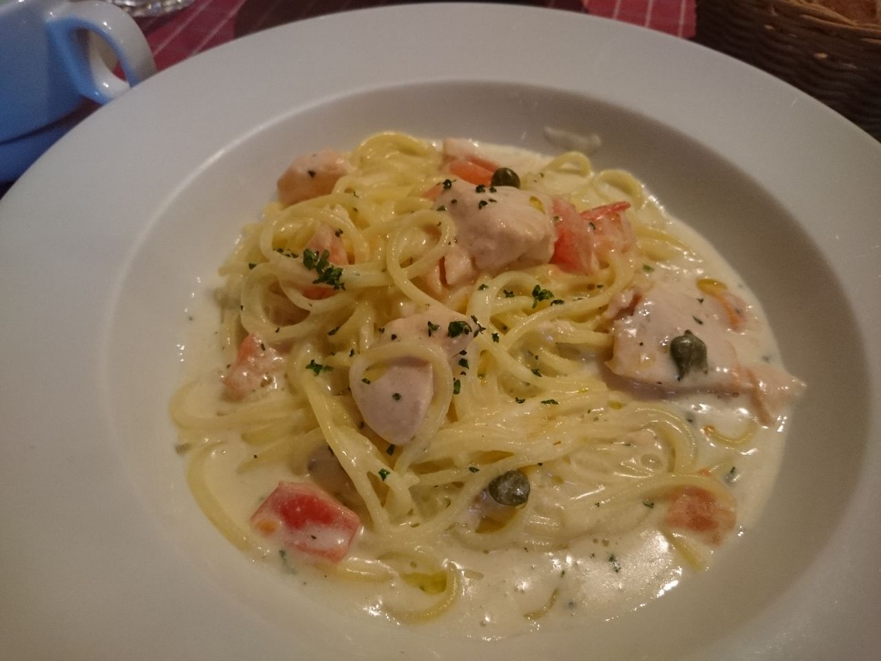 ごろごろっとかたまりのサーモンとフレッシュトマトが入ってるあっさりめのクリームパスタでした。