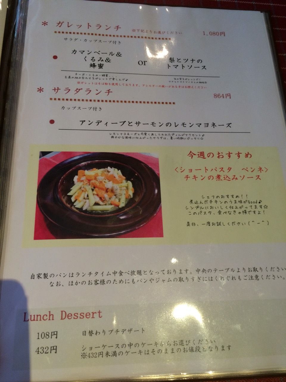パスタランチ、ガレットランチがサラダとパン(好きなだけ)がついて¥900。