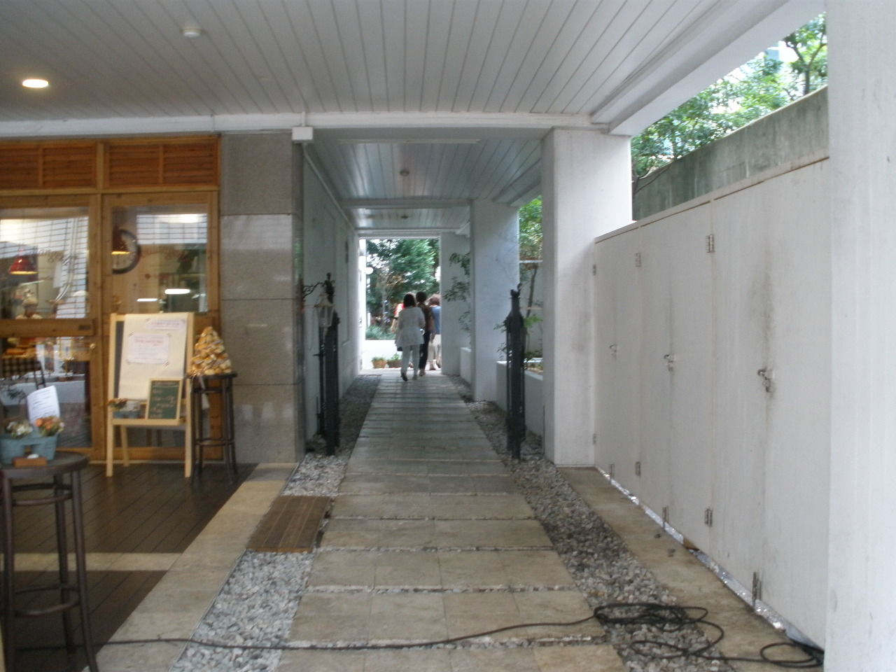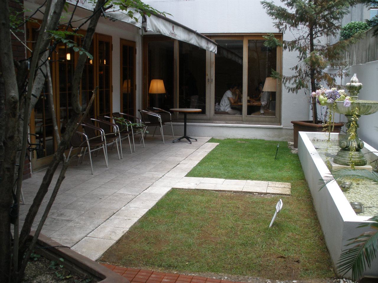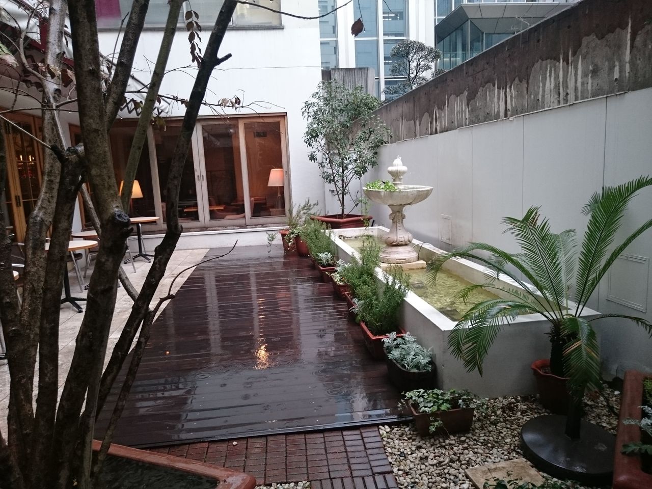 雨にぬれる中庭。左手にテラス席がちらりと見えます・・・か?!