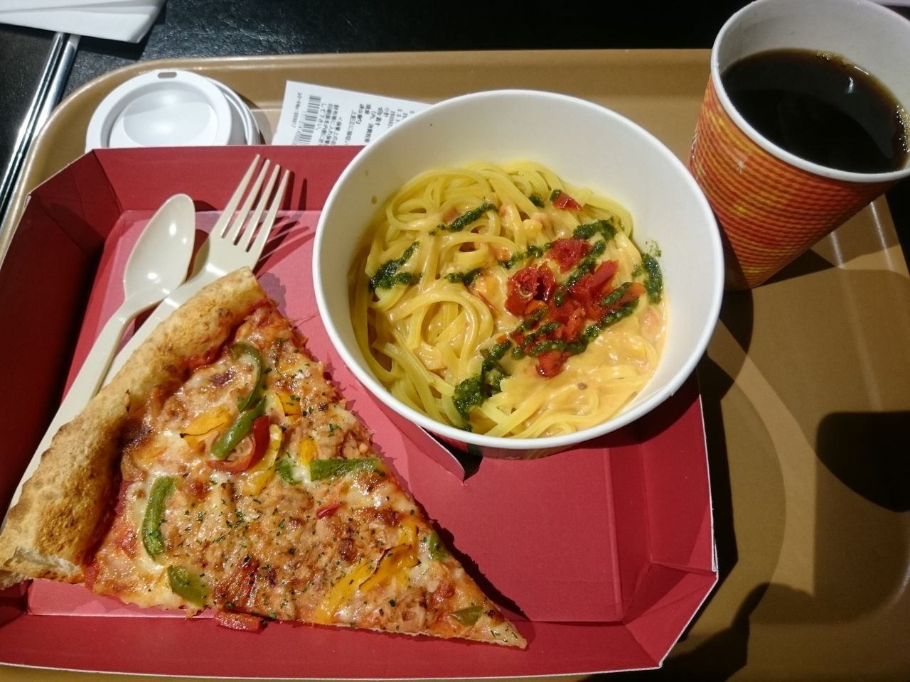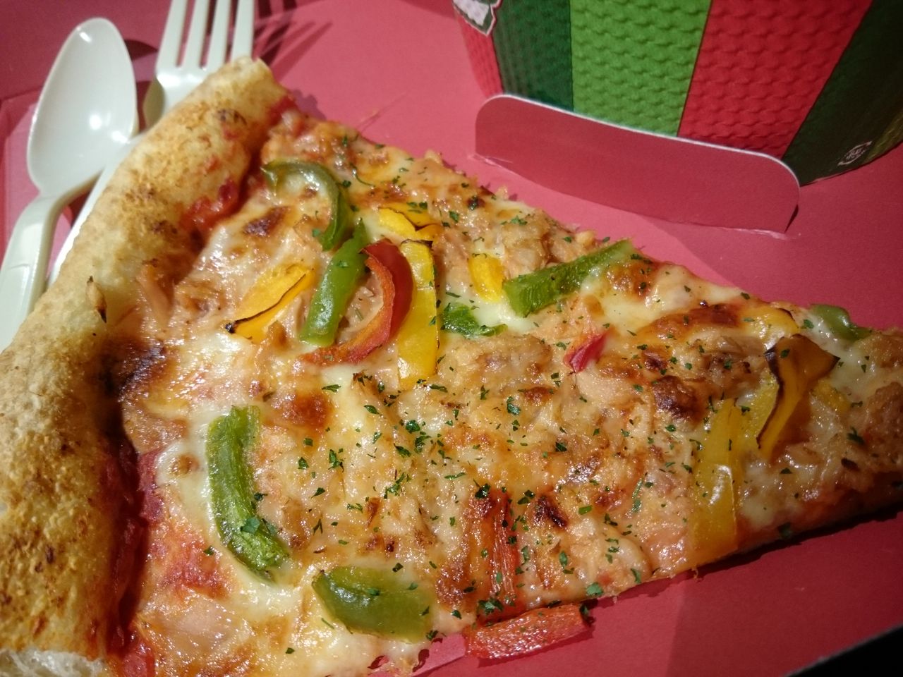 彩り野菜のピッツァは、きれいな色のパプリカとツナがのってました。1カットが結構大きいですが、薄~い生地なので、サクッと食べられました。