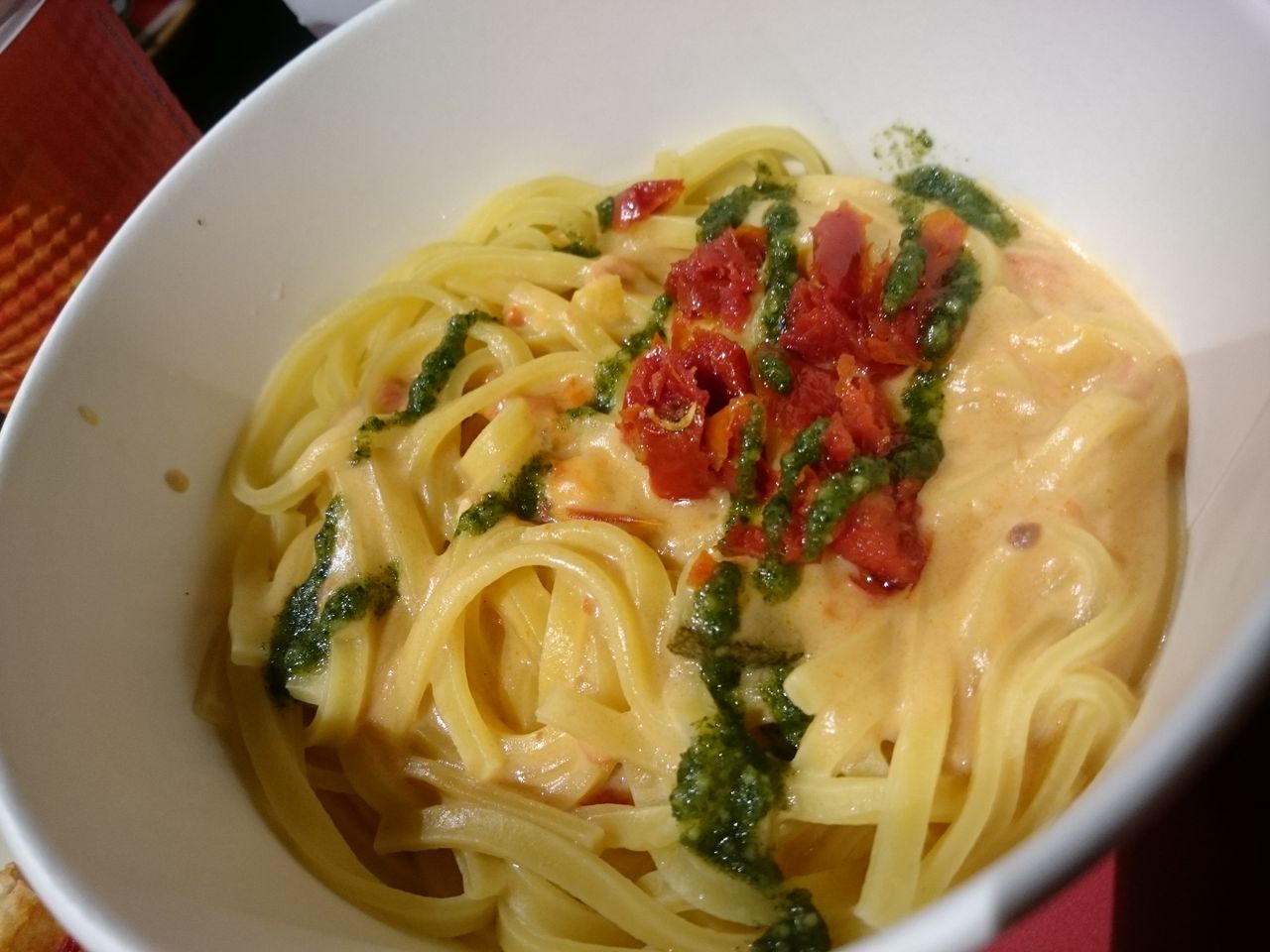 ドライトマトとバジルのクリームパスタは、クリスマスカラーです